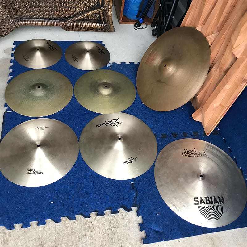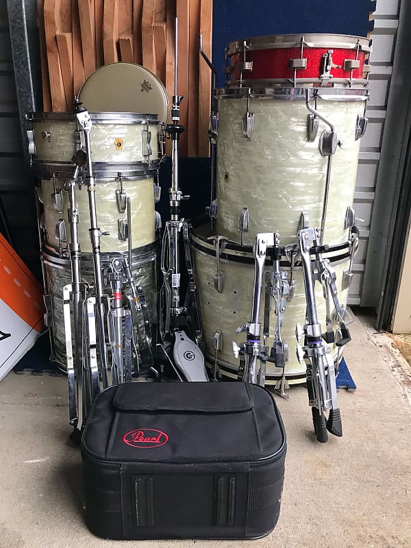 274Mid/late-60s Ludwigs in white marine pearl w/ matching snare, plus 14" Club Date floor tom in blue oyster pearl and a red sparkle Downbeat snare, plus a whole bunch hardware and a mess of cymbals. $800 all-in.